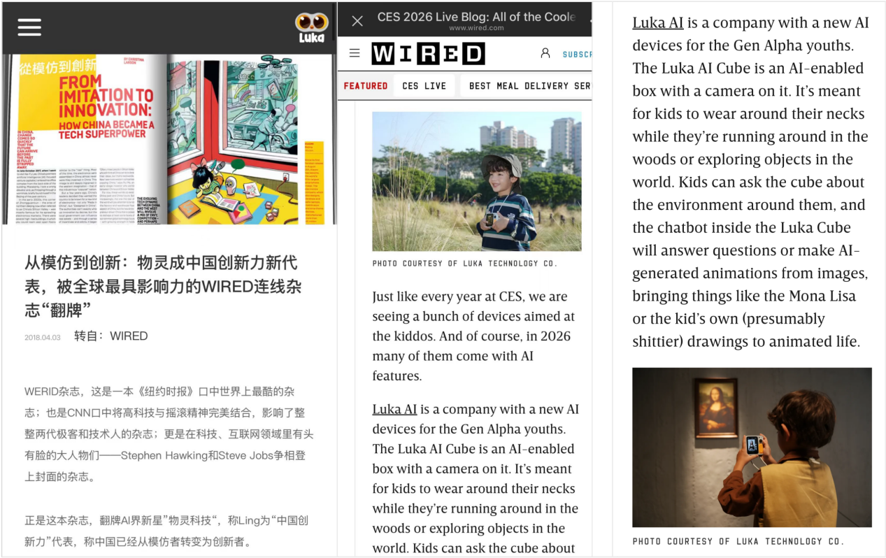 2018年,明星产品 Luka 以开创性的无屏幕交互设计同百度、腾讯、阿里、大疆一起,作为中国原创AI技术 Superpower代表,登上《Wired》(连线杂志),成为家庭 AI 陪伴领域的标杆;八年后,全新力作小方机在 CES 2026 盛会再续荣光 —— Wired在专题报道《CES 2026 Live Blog: All of the Coolest Tech We Saw》中,开篇即以长篇幅深度聚焦灵宇宙及小方机,盛赞其在阿尔法世代陪伴教育垂直领域的突破性创新。这份跨越八年的双重认可,不仅印证了品牌从 Luka 到小方机的持续领跑地位,更彰显了灵宇宙团队以 LingOS 多模态交互系统为核心、从 “感知 AI” 向 “Physical AI” 跨越的前瞻技术布局,以及将 “世界即课堂” 理念落地为真实场景价值的创新实力。