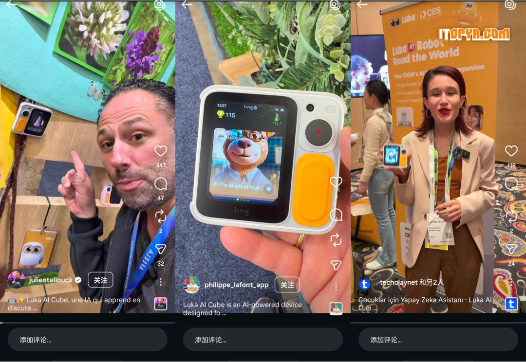 灵宇宙展台的强互动性吸引了大量全球科技博主打卡。拥有107万粉丝的 YouTube 博主Khan Flicks在《My Top Tech / Robot List at CES 2026!》中重点推荐了 Luka Cube ;土耳其头部博主Technopat(86.5万粉丝)发布的Shorts 视频《AI Toys for Kids! Luka Cube》直观展示了 AI 玩具的魅力;拥有81.2万粉丝的Instagram 博主Isabella Kubera发布了现场采访视频。