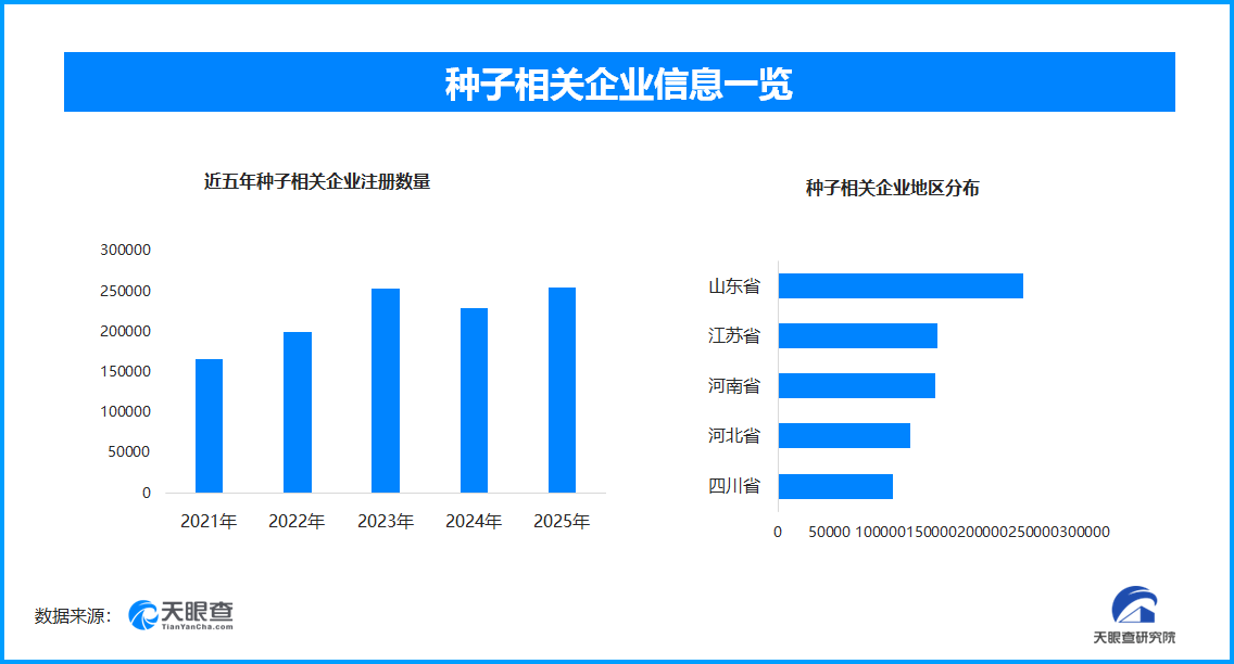 天眼查专业版数据显示,截至目前我国现存在业、存续状态的种子相关企业超217.9万家。其中,2025年新增注册相关企业约25.4万余家,从企业注册数量趋势来看,近五年间,种子相关企业的注册数量呈现出增长态势,并在2025年达到顶峰。
