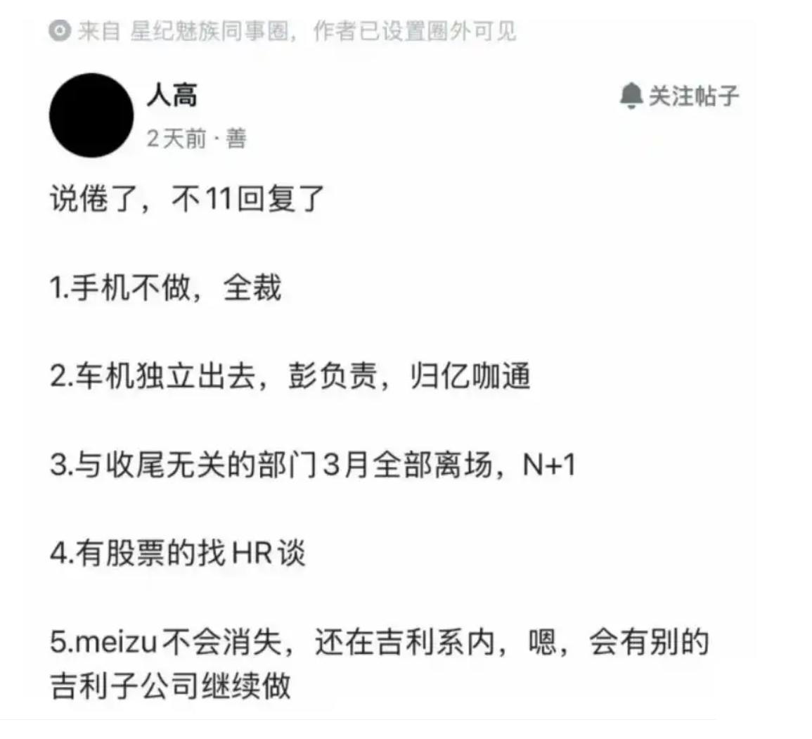 消息称,原定于年中发布的魅族23系列已实质性停摆,与手机业务收尾工作无关的部门将会在3月全部裁撤,补偿为N+1,部分员工可内部转岗至车机业务或吉利其他子公司;持有公司股权的员工,则需要与人力资源部门单独沟通处理方案。同时,Flyme Auto车机业务将由彭姓负责人接手,独立运营,深度融入吉利的智能汽车版图之中。
