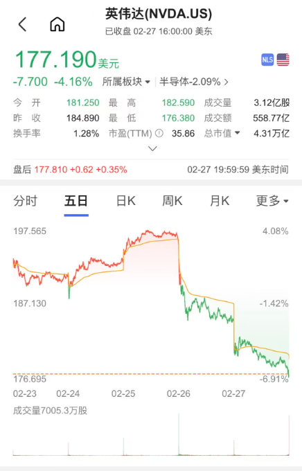当地时间 2 月 27 日,全球 AI 芯片龙头英伟达股价再度重挫,收盘报 177.19 美元,跌幅达 4.16%,单日市值蒸发 1871 亿美元,折合人民币约 1.28 万亿元,最新总市值回落至 4.31 万亿美元。这是英伟达在发布超预期财报后,连续第二个交易日大幅下跌,两个交易日累计跌幅近 10%,市值蒸发超 3.1 万亿元人民币。