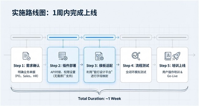 e签宝方案在实施部署方面的优势非常明显。由于该方案完全独立于金蝶的原生功能模块,企业可以自主完成全部部署工作,无需等待金蝶侧提供技术资源支持。这种独立性带来的最直接好处是大幅缩短了项目周期。根据实际项目经验,e签宝方案的标准实施周期仅需1周,而基于原生模块的方案通常需要数周甚至数月。