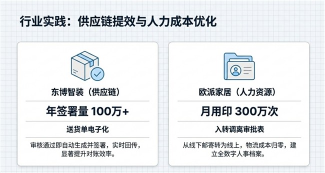 欧派家居作为大型家居制造企业,拥有庞大的员工队伍,每月有超过300万次的用印需求。人力资源部门在处理员工入转调离、劳动合同签署等事务时,面临着签署频次高、时效性要求强、涉及人员分散等挑战。通过在金蝶ERP系统中引入e签宝电子签章方案,欧派家居实现了入转调离审批表、劳动合同等人事单据的在线签署。原本需要员工到公司现场签署或通过邮寄方式往返的合同,现在可以在线完成签署,不仅节省了大量的人力成本和物流成本,也提升了员工的入职体验。