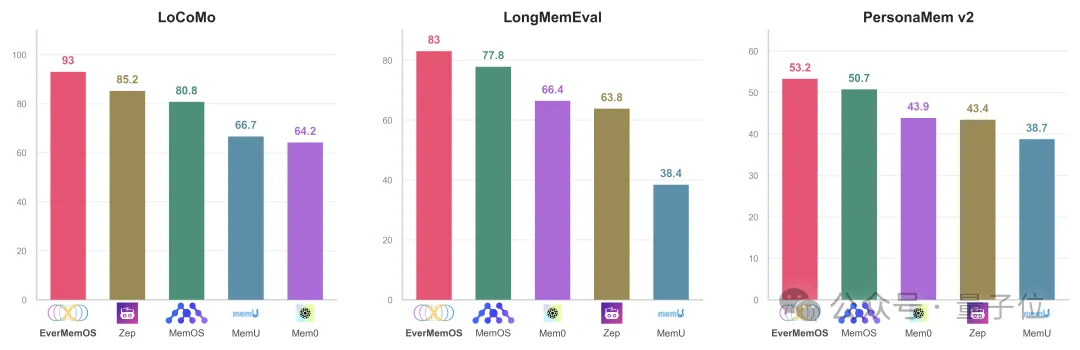 在PersonaMem v2里,EverMemOS在九个复杂场景中依旧全场最佳,保证了深度个性化和行为一致性。