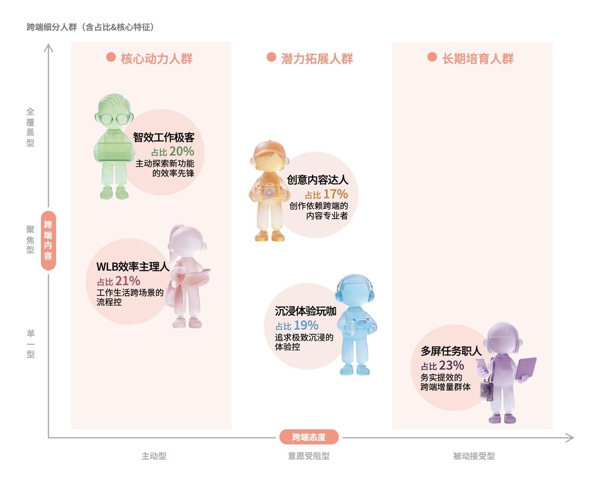 "智效工作极客"(25-29岁男性,新一线城市)是跨端生态的核心动力,他们几乎每日产生跨端操作,对效率工具、协同办公类产品需求强烈。"WLB效率主理人"(35-39岁女性,大都市新中产)则更注重生活品质与工作效率的平衡,健康、教育、生活管理类应用在这一群体中有机会。