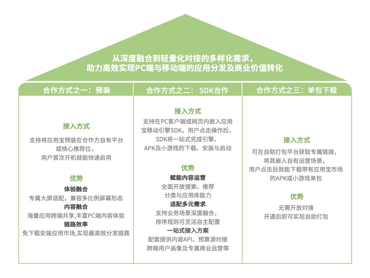 跨端生态不仅是技术升级,更是商业模式的重构。应用宝跨端开放平台系统性构建了PC专属的商业化解决方案,涵盖移动APP广告、电商DPA广告、移动游戏CPS分成等多种模式。