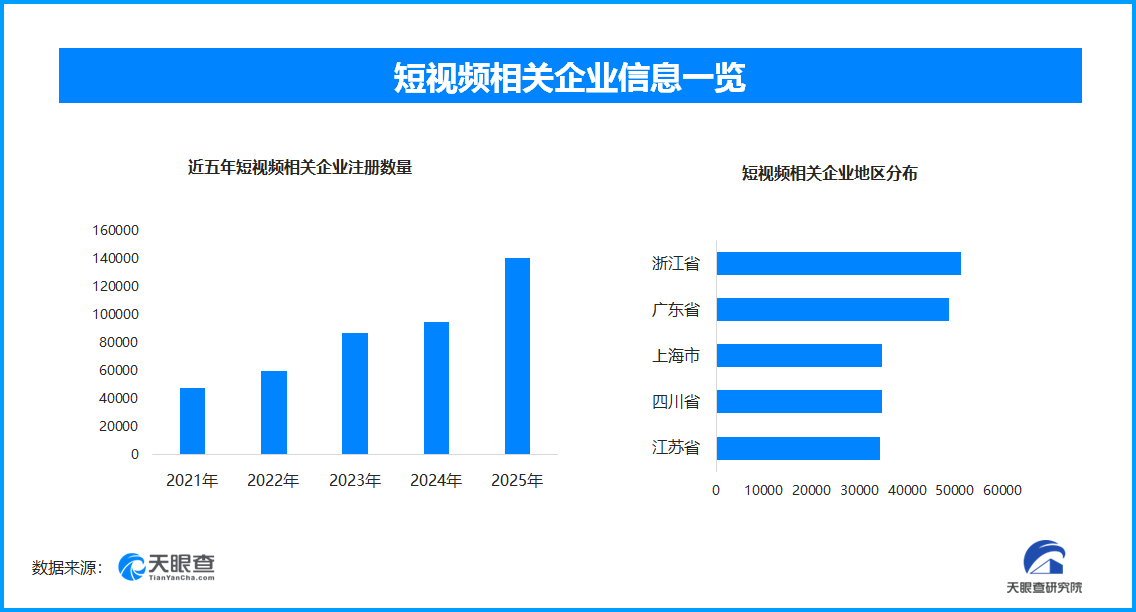 天眼查专业版数据显示,截至目前我国现存在业、存续状态的短视频相关企业超51.5万家。其中,2025年新增注册相关企业约14万余家,从企业注册数量趋势来看,近五年间,短视频相关企业的注册数量呈现出逐年增长的态势,并在2025年达到顶峰。