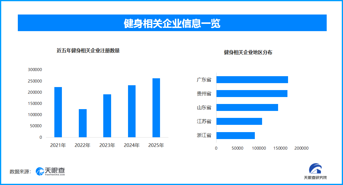 天眼查专业版数据显示,截至目前我国现存在业、存续状态的健身相关企业超167.5万家。其中,2025年新增注册相关企业约26.2万余家,从企业注册数量趋势来看,健身相关企业的注册数量在2021年就曾达到超22.3万余家的高峰,此后便锐减到2022年的12.5万余家,随着近年来的逐年增长,2025年再创峰值。