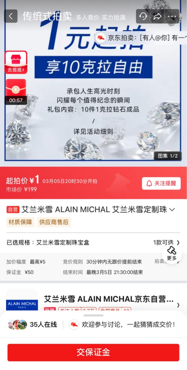 除了买黄金送钻石活动,艾兰米雪还将在3月5日至3月7日期间,于京东拍卖推出三场“1元起拍,享10克拉自由”活动。消费者只需搜索“钻石全家桶”即可参与竞拍,活动每晚8点开启,竞拍成功的消费者可以一次性拥有10颗不同款式的钻石成品,实现“克拉自由”。