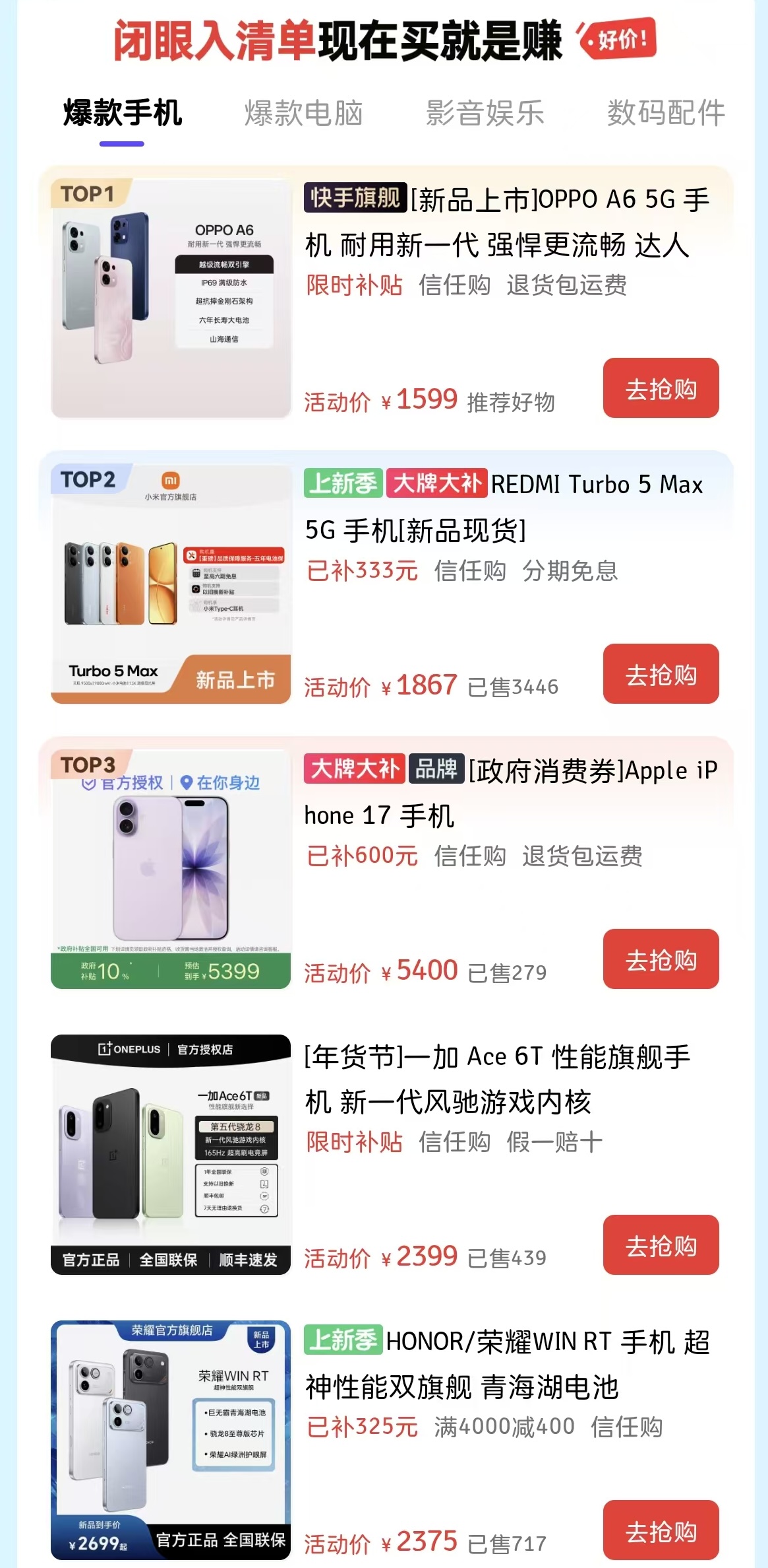 据悉,本轮国内手机数码厂商集中调价后,新品最低涨幅可达千元,老款机型也将迎来不同程度涨价,并且涨价趋势预计会持续较长时间。目前,消费者可上快手搜索#手机数码限时补 ,直达活动会场,了解补贴详情和低价福利产品。