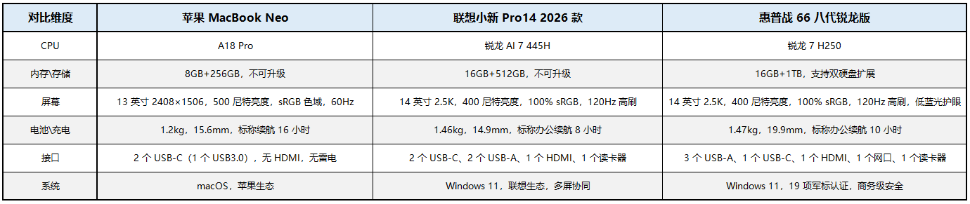 这个价位段上的Windows机型优势其实非常明显,尤其是存储规格,不仅标配16GB内存,存储也给到了512GB起步,惠普战66更是直接给到1TB SSD,同时屏幕支持120Hz高刷,多核性能远超MacBook Neo,无论是多任务办公、轻度视频剪辑,还是网游娱乐,都能覆盖更多场景。