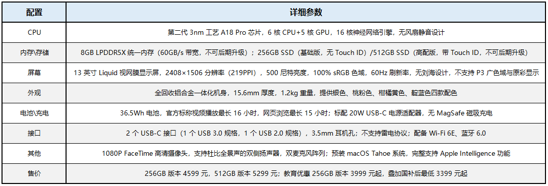 作为苹果史上最便宜的笔记本,MacBook Neo在配置上做了清晰的取舍,既守住了苹果核心体验的底线,也为了控制成本做出了明确的妥协,其官方核心配置参数如下表所示: