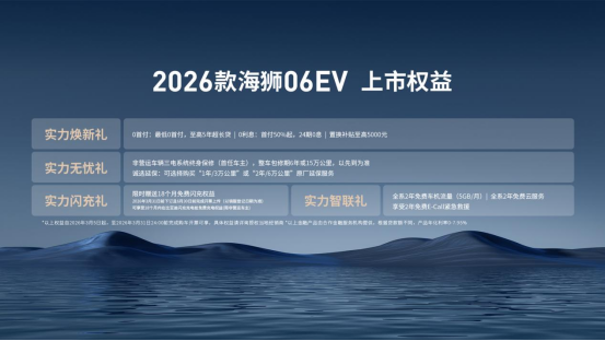 3月5日,比亚迪海洋网旗下高能超享纯电SUV——2026款海狮06EV正式完成焕新上市,官方指导价区间为15.99万元-17.99万元,具体车型售价分别为:605领航版15.99万元、710远航版16.89万元、605旗舰版16.89万元、710远航旗舰版17.99万元。上市同期,官方同步推出实力焕新礼、无忧礼、闪充礼、智联礼四大维度购车礼遇,为用户带来诚意满满的购车福利。