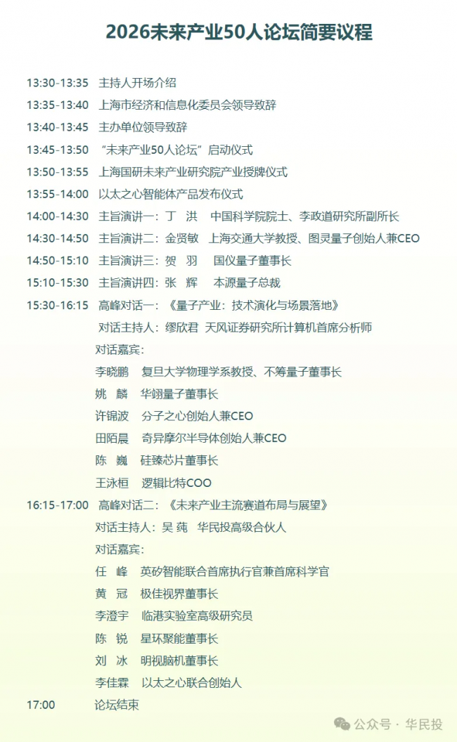 2026 上海全球投资促进大会即将于 3 月 14 日在上海浦东盛大启幕。本届大会设置了金融赋能活动版块,特邀四家知名金融机构——国泰海通、上海国投、华民投与浦发银行分别举办四场论坛。其中华民投联合上海国研未来产业研究院主办的“未来产业 50 人论坛”备受瞩目。该论坛汇聚六大未来产业的领军企业和科研院所,聚焦前沿科技领域、热门赛道,共话未来产业的投资机遇。本次论坛是开幕论坛,邀请了量子科技、脑机接口、具身智能、生物制造等未来产业的领军人物、院士专家共同为论坛启幕,同时围绕量子科技举办首场活动。