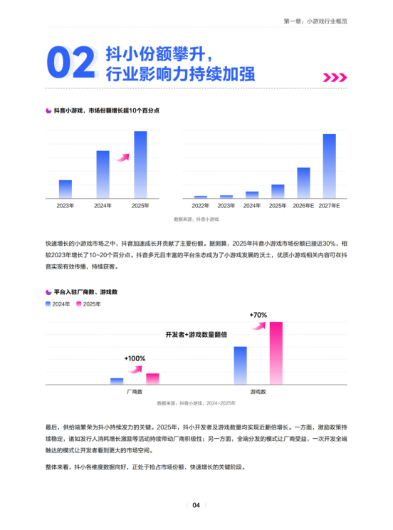 总体来看,小游戏行业正逐步迈入加速发展的新阶段,玩法及品类日趋丰富、玩家社交/互动意愿增强。未来,如何围绕抖音小游戏生态实现营销侧的长线运营和持续获客,是小游戏企业于行业脱颖而出的关键。