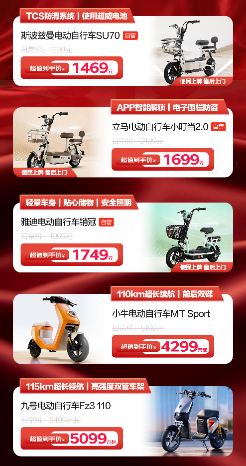 事实上,为保障广大居民的用车安全,国家相关部门此前已颁布《电动自行车安全技术规范》(简称“新国标”),并于去年9月开始正式实施。在此背景下,京东汽车也联合爱玛、雅迪、立马、台铃等知名品牌,积极响应市场需求与监管要求,通过自营电动自行车,为消费者提供从送车到家、便民上牌到上门售后的一站式安心服务,全链路护航骑行安全。