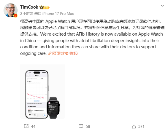 苹果公司CEO蒂姆·库克今日发文宣布,专为中国大陆 Apple Watch 用户打造的“移动脉率房颤迹象记录”功能正式上线。该功能即此前备受期待的房颤历史功能,旨在为已确诊房颤的用户提供更全面的健康管理支持。
