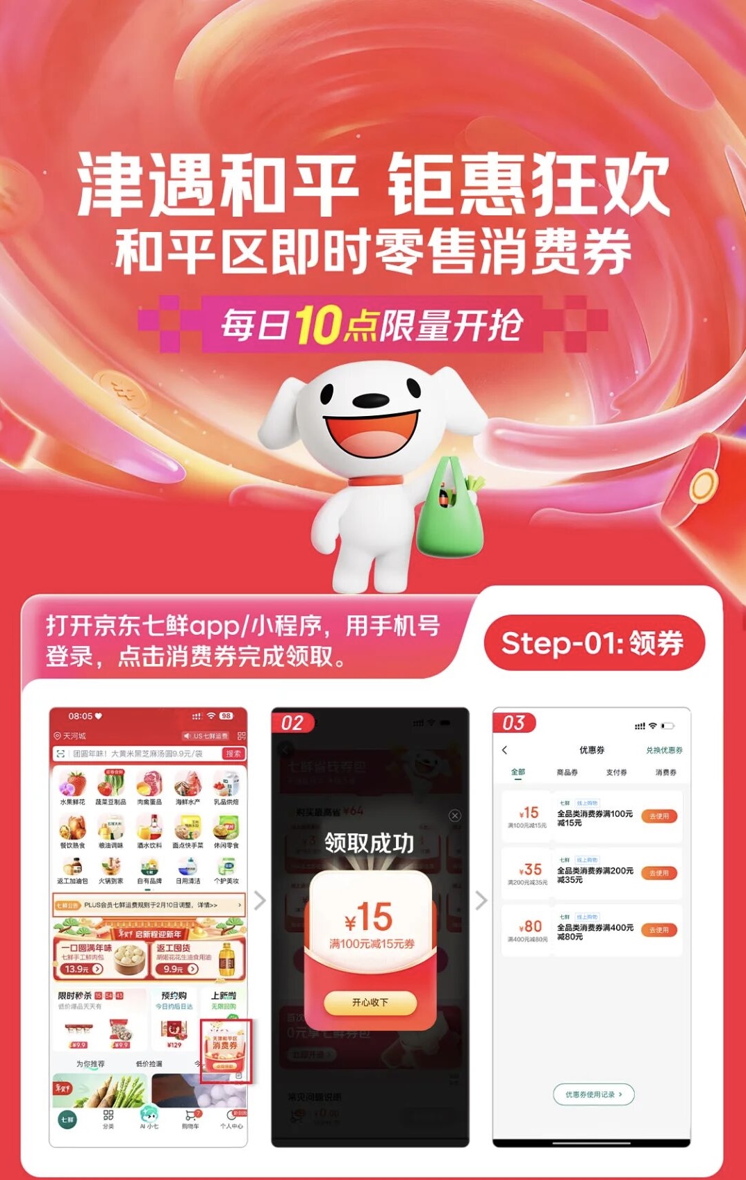 此次和平区即时零售消费券发放规则清晰、领取便捷:每日上午10点在京东七鲜超市APP或微信小程序准时限量开抢,数量有限,先到先得,领取后当日有效,逾期自动作废。除部分特殊商品、次日及以上送达商品不参与外,优惠券全场均可使用。线上下单时,购物车满足金额后自动抵扣。店内自助收银机结算时,使用七鲜APP或小程序扫码登录账号,满足门槛后消费券也将自动抵扣。参与活动的门店包括七鲜超市天津K11店、天津白堤路店、天津乐宾百货店等九家核心门店,覆盖多个城区,方便市民就近参与。