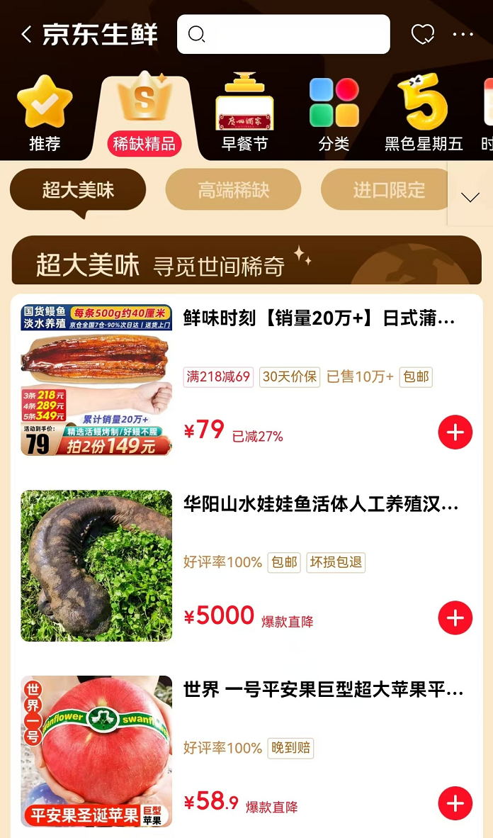 除了超大生鲜,京东生鲜还汇聚了来自全球各地的稀缺、珍奇好物。比如,占比不足万分之七的新疆有机和牛“天莱香牛”,礼盒装市场价6000多元,以1004元拍出,不到2折;来自冰岛的十年北极红参王,单只300克,原生巨参的品质远超普通养殖海参,是典藏级滋补佳品,拍卖价149元,不到市场价一半;世界上最古老的鸟类之一——澳大利亚鸸鹋蛋,有“蛋中之王”美誉,墨绿色蛋壳下包裹着丰富的营养元素,集稀缺、观赏、仪式感于一体,市场价128元,拍卖后仅68元;还有与“神舟三号”飞船搭载的乌鸡蛋同源的泰和乌鸡、前蹄拥有七个孔的四川漫养土猪七星猪蹄……这些平日里难得一见的稀缺食材,也被京东生鲜搬上了拍卖,以超高性价比满足消费者的尝鲜渴望。