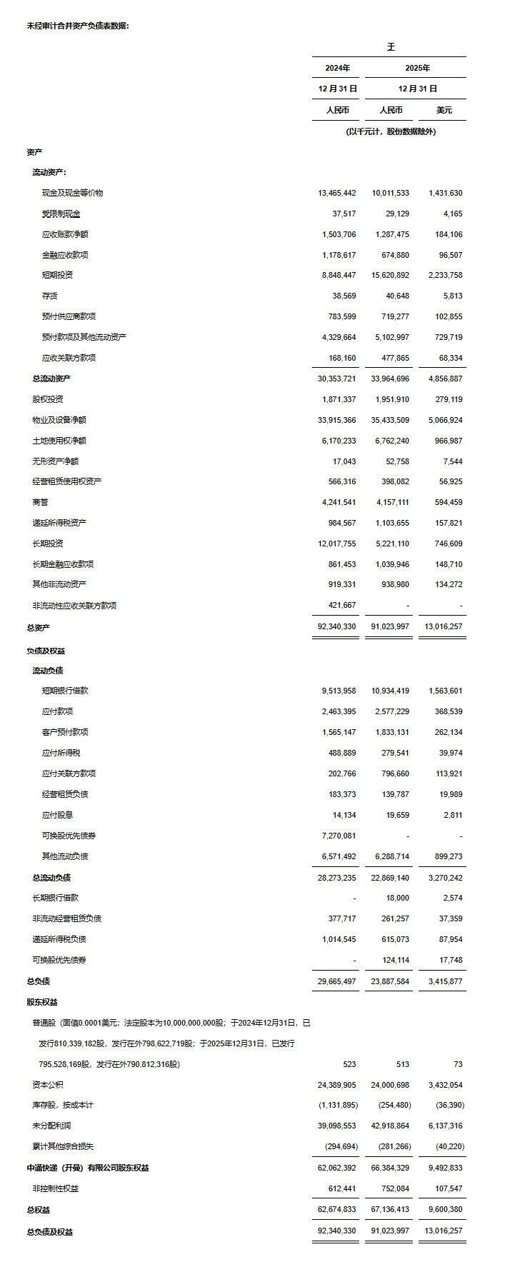 中通快递(开曼)有限公司(纽交所代码:ZTO及香港联交所代号:2057),中国领先且快速成长的快递服务公司("中通"或"本公司"),今日公布其截至2025年12月31日[1]止第四季度及财年的未经审计财务业绩。2025年全年,本公司实现包裹量同比增长45亿件或13.3%,同时保持优质服务及客户满意度。调整后净利润[2]达人民币95亿元。经营活动产生的现金流量净额为人民币11,968.4百万元。