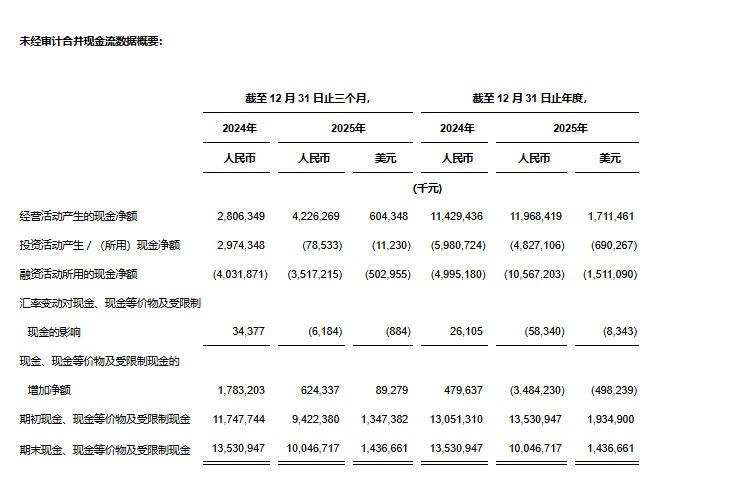 • 经营活动产生的现金流量净额为人民币11,968.4百万元(1,711.5百万美元),而2024年则为人民币11,429.4百万元。