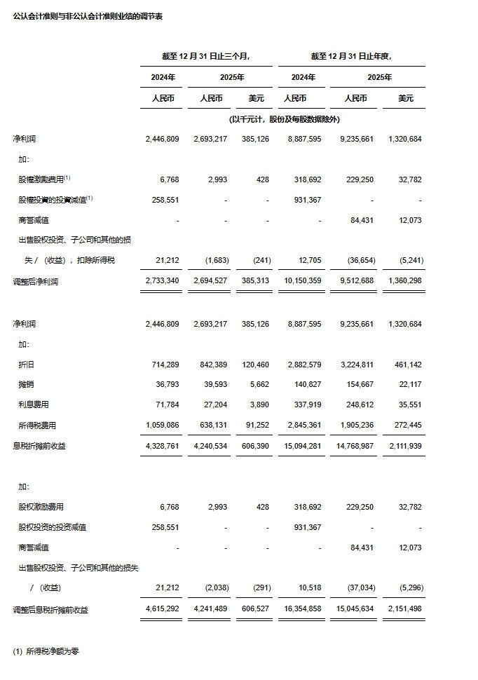 • 净利润为人民币9,235.7百万元(1,320.7百万美元),较2024年的人民币8,887.6百万元增长3.9%。
