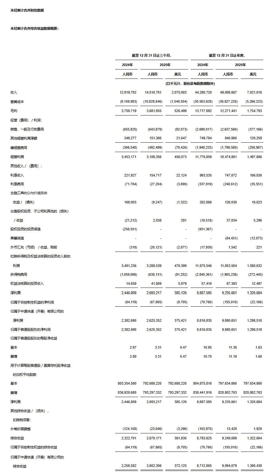• 包裹量为10,558百万件,较2024年同期的9,665百万件增长9.2%。