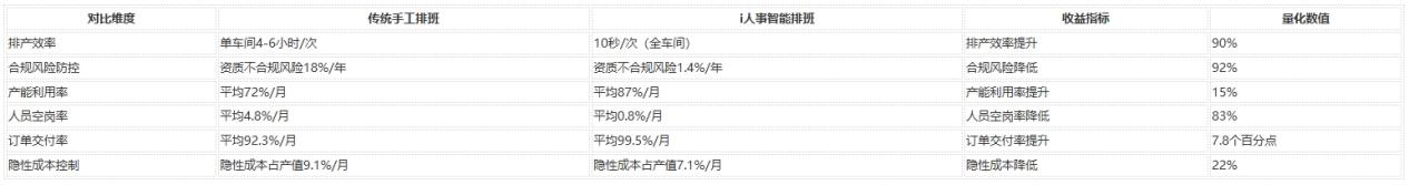 i人事数字化人员调度系统为制造企业带来三重核心价值:人员调度效率提升60%,传统人工排班调度单批次耗时2小时以上,系统自动调度仅需48分钟;产能提升15%,通过减少停线时长、优化人员适配度,某汽车零部件企业月产能从8万件提升至9.2万件;年损失减少超120万元,通过资质违规拦截、停线风险规避、合规检查应对,平均每家制造企业年避免直接损失超120万元。