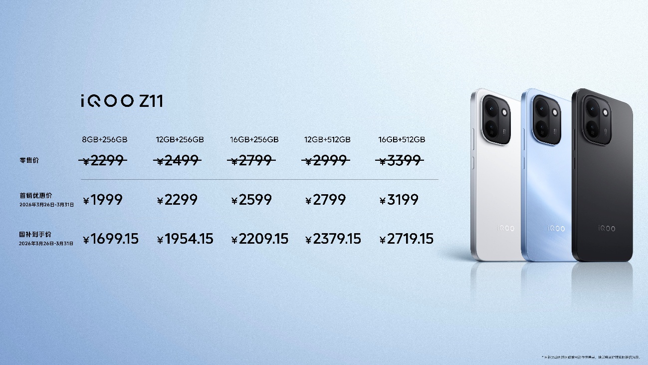 2026 年 3 月 26 日,“性能续航小超人”iQOO Z11 系列正式发布并已全渠道开售,首销补贴到手价 1499 元起,国补后到手价 1274.15 元起。iQOO Z11 越级首发 iQOO 品牌首款 165Hz 护眼电竞屏和史上最大 9020mAh 超薄蓝海电池,带来同档位越级体验。