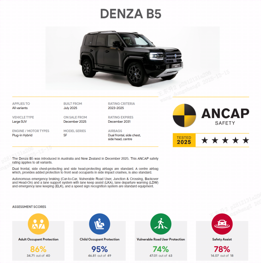 据悉,该测试结果是全球领先的汽车安全评估机构——澳洲新车安全评鉴协会(ANCAP)正式公布的车型安全评级,方程豹豹5凭借硬核技术及扎实用料,拥有卓越的主动和被动安全性能,并因此荣获五星安全评级。在成人保护、儿童保护、行人保护、安全辅助等四大核心板块测试项目均达到全球领先水平,其中儿童保护得分率为95%,是ANCAP历年测试结果中排名最高的车型之一。