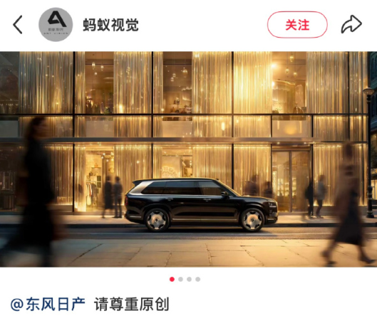 4月1日,传统制作公司蚂蚁视觉在社交平台公开喊话东风日产,指后者旗下NX8车型的广告宣传图涉嫌抄袭其2025年为极氪9X、尚界H5制作的广告创意。
