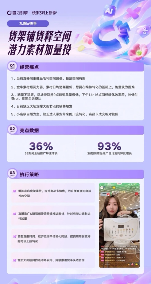 小家电品牌九阳在38前面临低价主推品毛利空间有限、素材爆发力不足及流量不稳定等问题。通过增加小店货架铺货提升商品卡销售,为自播释放投放空间,同时持续强化直播与短视频联动,对潜力素材进行重点加投,并优化直播时段、集中资源布局大场节点。38期间全站推广日均消耗达8700,商品推广日均消耗环比增长93%。