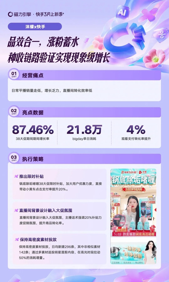 家清品牌沫檬在平播走弱、转化效率不足的情况下,通过推出锅底除垢啫喱限时补贴,显著提升优惠力度,带动点击支付率提升20%;同时强化直播间大促氛围与话术表达,并保持高频素材投放,日均新建296条,通过多素材追投拉动消耗增长。整体增长率达87.46%,bigday单日消耗21.8万,观看支付转化率提升4%。