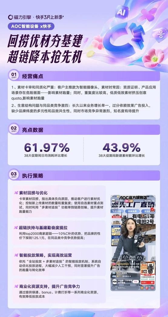 AOC在投放过程中,长期受到素材卡审严格、内容同质化以及生意结构单一的制约,同时还面临激烈的品类竞争。38期间,通过卡审素材回捞明确负向原因并优化素材结构,控制上传数量与重复度,重点测试优质自选素材并结合多素材追投策略;叠加TOP2000商家超链10%C补优势,将价格下探至125.1元,在全站投放与智能追投机制加持下,3月日均消耗环比增长61.97%,GMV突破百万。