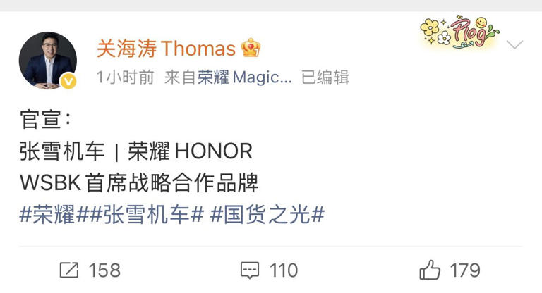 2026年4月8日,荣耀正式对外宣布,与张雪机车达成战略合作,成为其征战世界超级摩托车锦标赛(WSBK)的首席战略合作品牌。