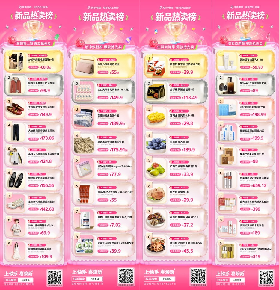 这成绩背后是快手电商在新品生态经营上的持续发力,从年货节延续到上新季,重点针对新品提供了更多扶持措施。一方面,简化大促玩法,官方75折覆盖内容场和货架场,新品获得更大力度的补贴;另一方面,大促前期启动开播抢跑排位赛、短视频争霸赛等活动专属流量激励优先开播、新品短带的商达,助力抢占声量和销量的先发优势。正式期,推出快手“春日上新超有料”上新大场直播活动,并上线趋势品类、新品热卖榜等营销活动和经营指南,持续释放平台焕新生意增长潜能。