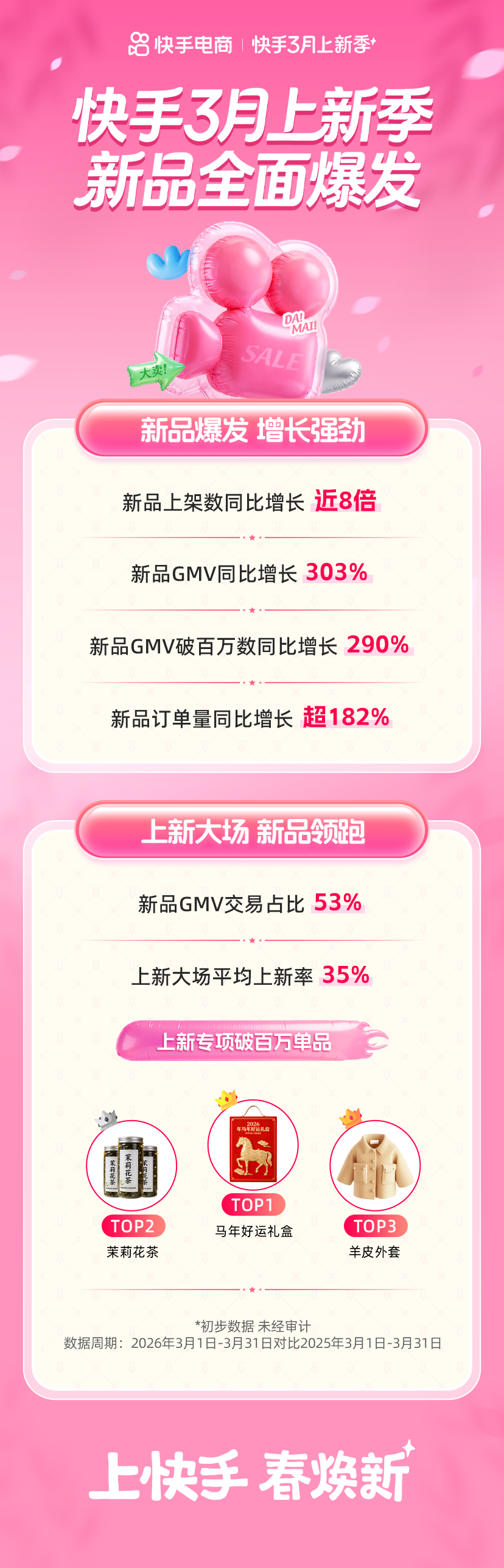 春日焕新消费季落幕,快手3月上新季收官。近日,快手公布数据显示,活动期间,平台新品GMV同比增长303%,新品GMV破百万数同比增长290%,新品订单量同比涨超182%。在3月上新季多重扶持新品政策下,快手上的新品尖货迎来集中爆发。