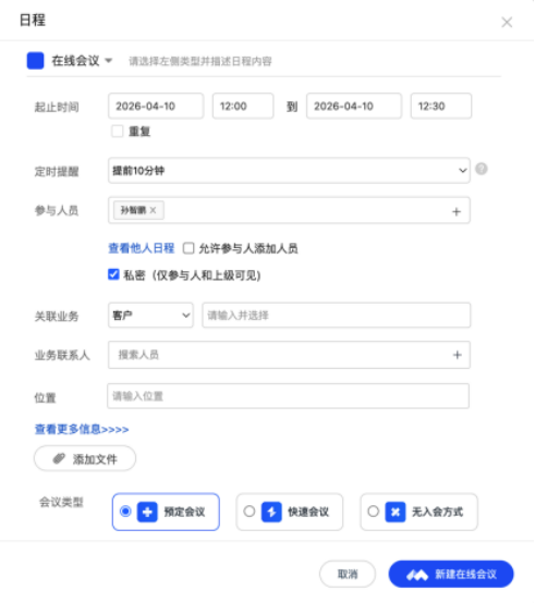 销售易CRM与腾讯会议整合方案下,业务人员可在客户日程中点击“发起会议”,系统自动生成专属入会链接,并根据CRM中的客户联系方式,一键推送会议通知并同步至参会人员日历。同时,它为每一位受邀人生成了唯一身份标识的入会链接——无论对方用微信个人号还是企业账号登录,系统都能精准识别。