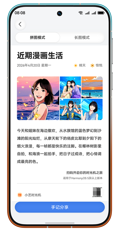 • 小艺时光机,回忆自动成册:无暇整理照片?小艺时光机能自动生成时光轴和图文游记。这次,小艺时光机新增“漫画生活”“亲子成长”“节日欢聚”三种主题,可以将日常照片转变为温暖治愈的漫画日记,让有娃家庭随时查看孩子的成长轨迹,或者主动珍藏起与家人朋友共度的节日欢乐时光。你尽管去热烈拥抱生活,小艺时光机会默默帮你把生活记录成诗。