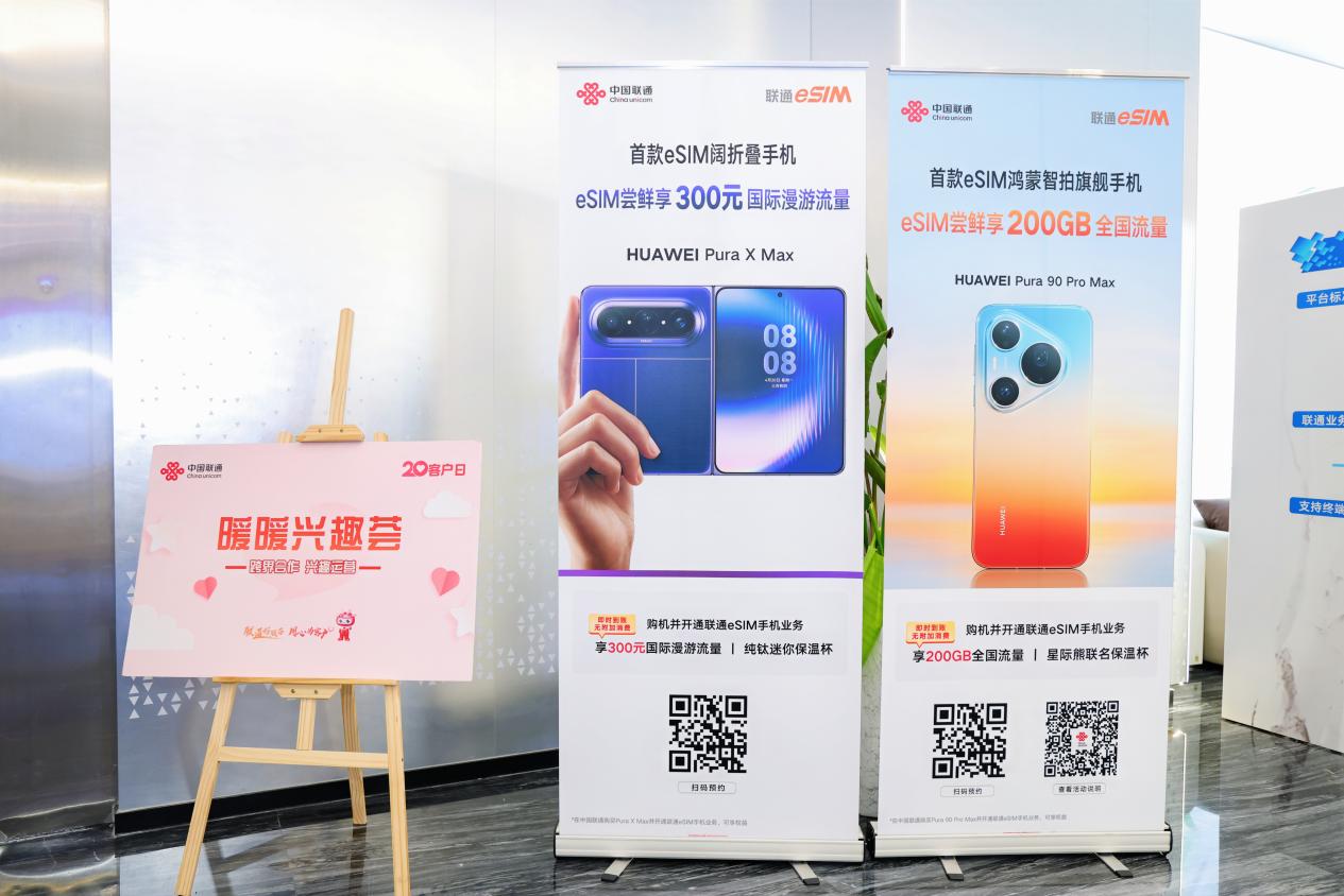随后中国联通和华为领导共同登台为eSIM合作揭牌,双方将围绕AI与eSIM融合、用户体验优化等领域展开更深层次合作。现场互动问答环节气氛热烈,首批预约用户登台合影留念并分享了eSIM一机多号带来的便捷体验。现场设置的华为新品体验专区,让来宾直观感受了空中写卡、即开即用的便捷流程。