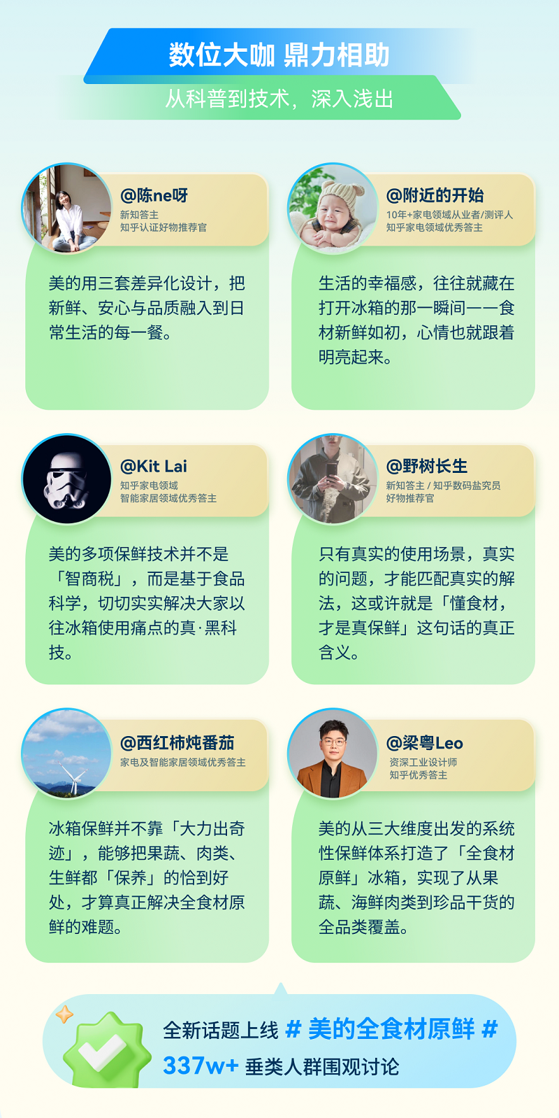 首先,在知乎上掀起一波讨论,提出一系列普通人选购或使用冰箱时真正关心的问题:两三天内要吃的肉,到底该冷藏还是冷冻?为什么普通冷冻解冻后肉会变柴?从果蔬到海鲜肉类再到珍品干货,冰箱到底怎么才能做到全食材原鲜?那些听上去很厉害的保鲜技术,到底是黑科技,还是智商税?