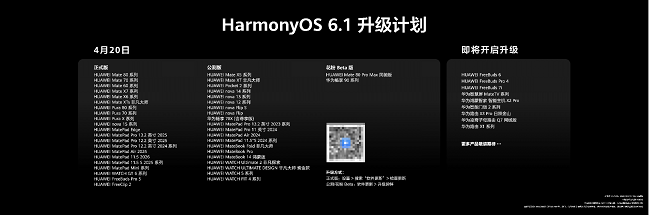 而HUAWEI Mate X5 系列、Mate XT 非凡大师以及 Pocket 2 系列则开启了公测版升级,用户可通过软件更新中的“升级尝鲜”功能,提前感受HarmonyOS 6.1的独特魅力。