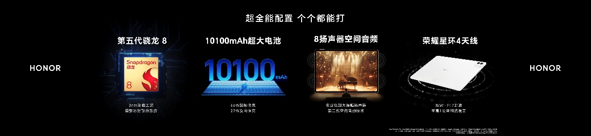 荣耀MagicPad3 Pro 12.3搭载第五代高通骁龙8旗舰芯片,配合荣耀冰封散热架构,实现满血性能稳定释放,高效平衡性能功耗,为多任务处理、视频后期、AI运算、3A游戏运行提供强劲性能;内置10100mAh超大电池,支持66W超级快充、27W反向充电,不仅告别续航焦虑,还能为iPhone等其他系统设备充电;荣耀自研星环四天线,支持双Wi-Fi 7加速,实现一公里超远距网络覆盖;八扬声器与第三代空间音频技术加持,进一步拓展了娱乐、学习等使用场景,结合全维度软硬件生态融合,覆盖用户使用痛点,打造全场景极致体验。