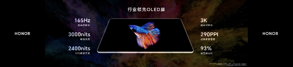 极致轻薄机身之下,荣耀MagicPad3 Pro 12.3搭载一块3K 165Hz全球顶级OLED旗舰屏幕,采用iPad Pro同款Hybrid OLED技术,屏幕边框宽度仅有3.9mm,峰值亮度3000nits,行业领先的5280Hz超高频PWM调光,八大绿洲护眼技术,行业首发搭载芯片级AI离焦护眼和DOT护眼技术,带来出众观看效果的同时兼顾护眼健康,屏幕综合素质断档领先,刷新旗舰平板屏幕天花板。