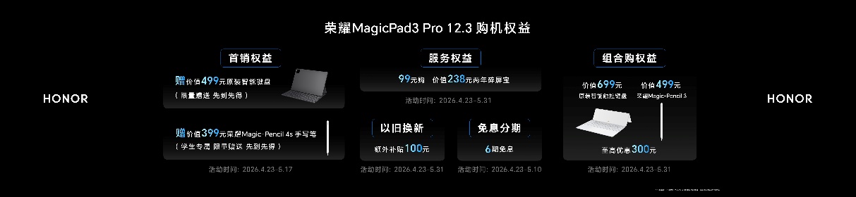 荣耀MagicPad3 Pro 12.3现已在荣耀商城、授权电商平台、荣耀体验店、授权零售门店等官方销售渠道开售,4月23日至5月17日期间,购买荣耀MagicPad3 Pro 12.3限时赠送价值499元原装智能键盘、学⽣认证送价值399元荣耀Magic-Pencil 4s手写笔;4月23日至5月10日期间,享6期免息分期;4月23日至5月31日期间,99元购价值238元2年碎屏宝、以旧换新补贴额外补贴100元,组合购原装智能触控键盘和荣耀Magic-Pencil 3触控笔⾄⾼优惠300元等福利权益。所有福利,数量有限,先到先得。荣耀MagicPad3 Pro 12.3国补优惠价3499元起。