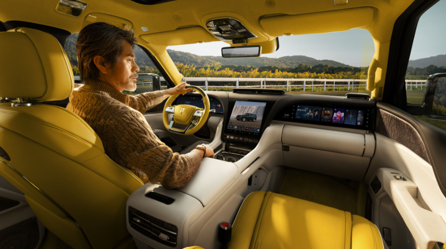 车内采用中轴对称的建筑形制美学,营造“四平八稳”的气势。新增“鸣沙金”内饰配色,采用黄白拼色设计,灵感源自敦煌鸣沙山与月牙泉的日出盛景,跳脱出传统行政座驾的沉闷框架。座椅特别定制“山纹刺绣”,取形于丝绸之路的生命线——祁连山脉的轮廓,融入书法笔墨意蕴,寓意广阔山河。配合座舱前部的飞流瀑布曲面屏,构筑出“前有江河奔涌,后有群山倚靠”的辽阔气势。此外,内饰用料全面升级,采用半苯胺真皮与成材率仅2‰的沙比利天然硬木,触感细腻,尽显奢华。