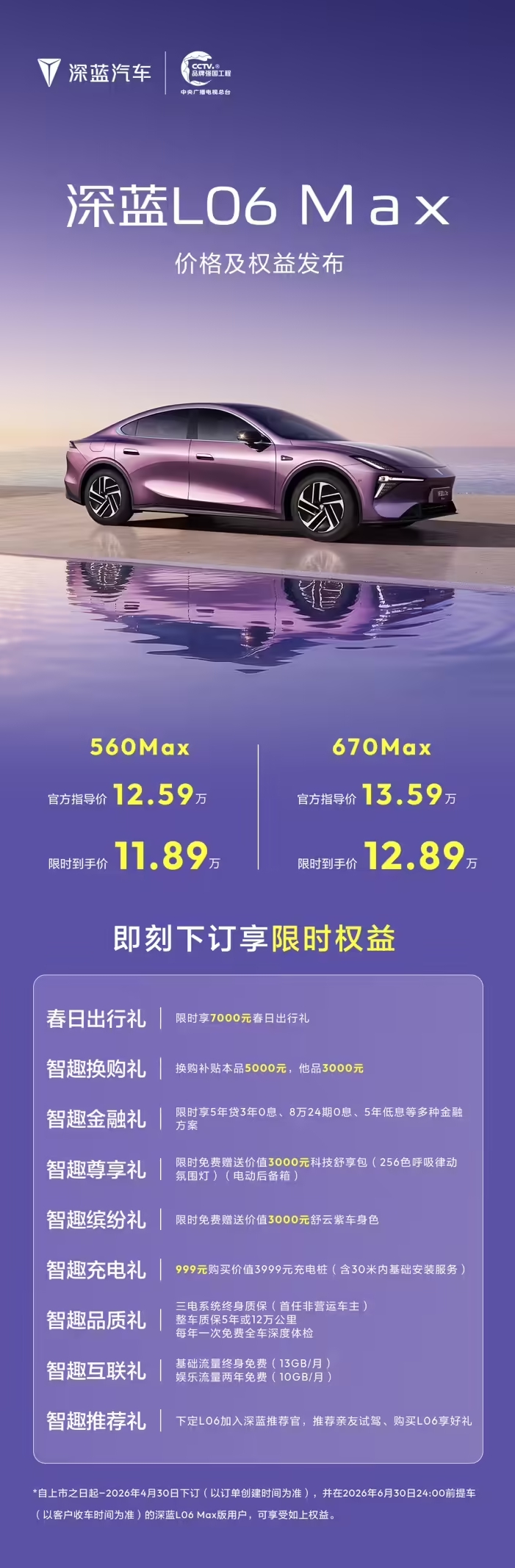 配置方面,深蓝 L06 Max 提供 560Max 和 670Max 两款配置,售价分别为 12.59 万元、13.59 万元,参加官方预订活动,权益后到手价分别为 11.89 万元、12.89 万元。
