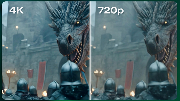 通过一段高速动态测试视频可以发现,可灵AI原生4K能力输出的视频清晰度显著提升、画面细节更丰富。即便在高速运动和复杂光影环境下,巨龙的鳞片和皮肤质感依旧细腻,甚至远处建筑的纹理细节同样清晰可辨,全面达到院线级画质水准。