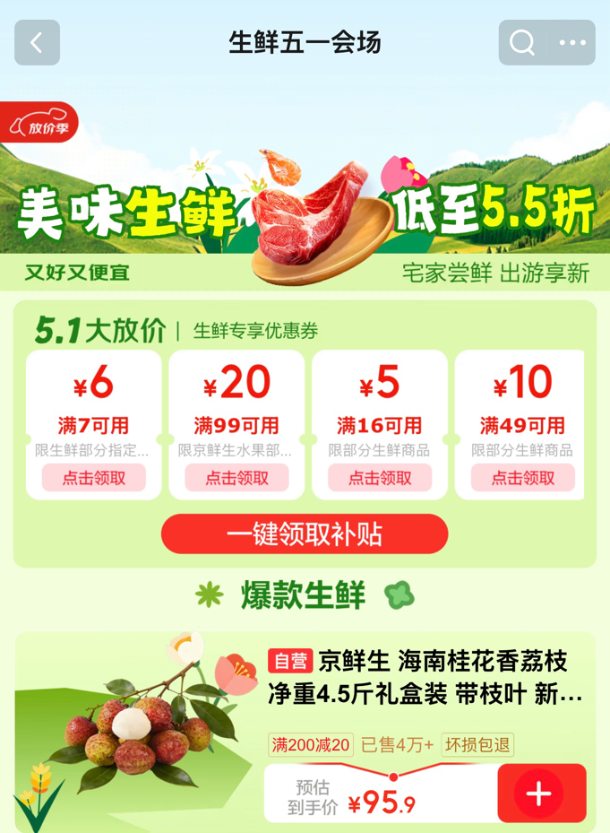 五一出游购生鲜,省心省钱选京东。从“今日最便宜”的极致低价好物,到爆款云集的“五一大放价”活动,京东生鲜把真低价、高品质、好服务从节日特惠,慢慢变为可持续的日常消费常态。依托超级供应链,京东生鲜持续夯实价格竞争力与品质保障力,全方位满足大众果蔬、肉蛋、水产、熟食等一站式生鲜消费需求。未来,京东生鲜将持续扩充商品矩阵,不断强化价格优势与供应链能力,为消费者带来更多高性价比生鲜好物,也为商家及行业发展提供助力。