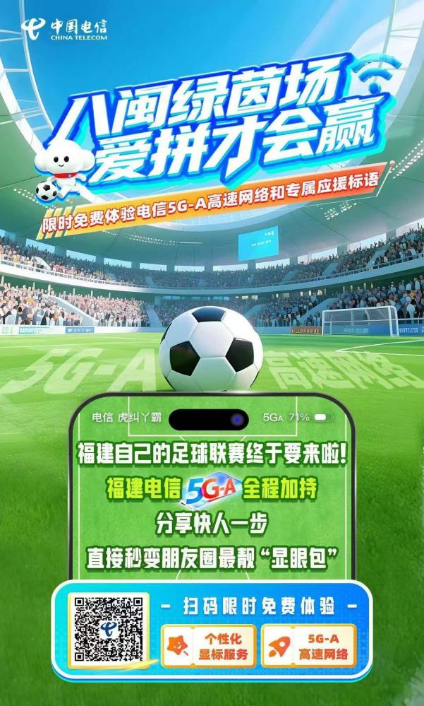 福建电信为现场球迷定制UE显标服务,手机信号栏自动显示闽超专属图标,打造专属数字身份与观赛仪式感;同步开放5G-A高速网络限时免费体验,让数万观众畅享科技与足球融合的双重快乐。